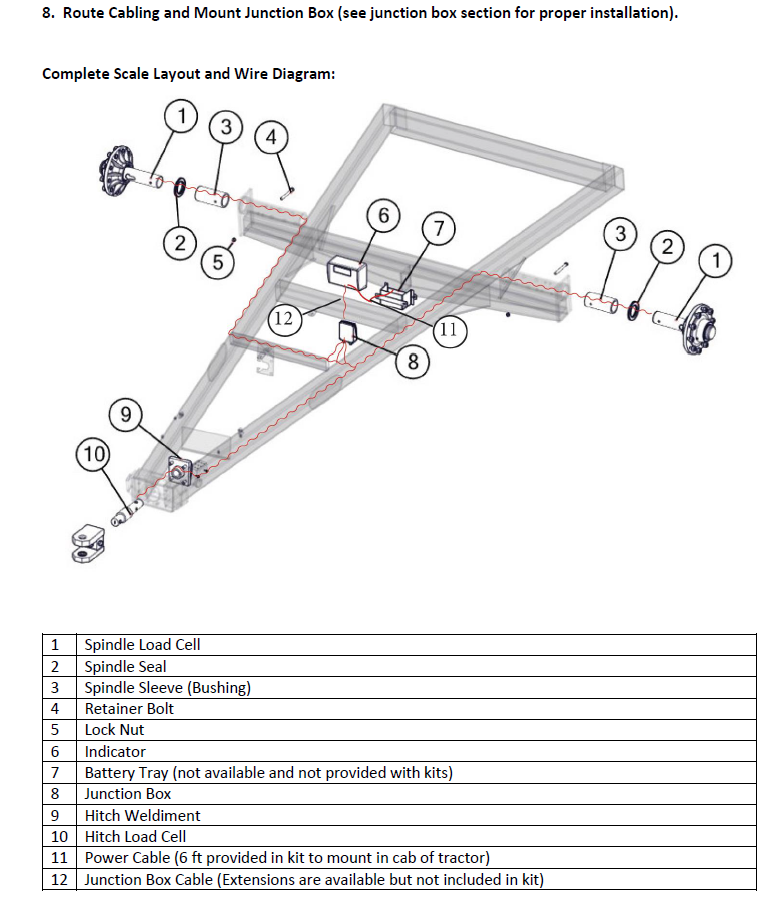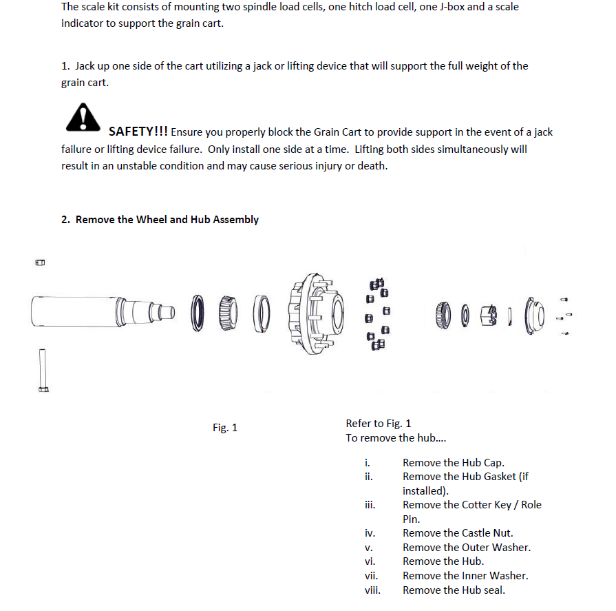 Scale Installation The scale kit consists of mounting four axle support load cells, one hitch load cell, one J-box and a scale indicator to support the hopper. 1. Hitch Grain Cart to Tractor. Park the grain cart on a firm level surface. Ensure you ...
