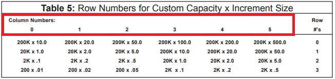 4. The new configuration number will be 19_00. Fill in the third digit with the corresponding column number from the table below based on the desired increments.