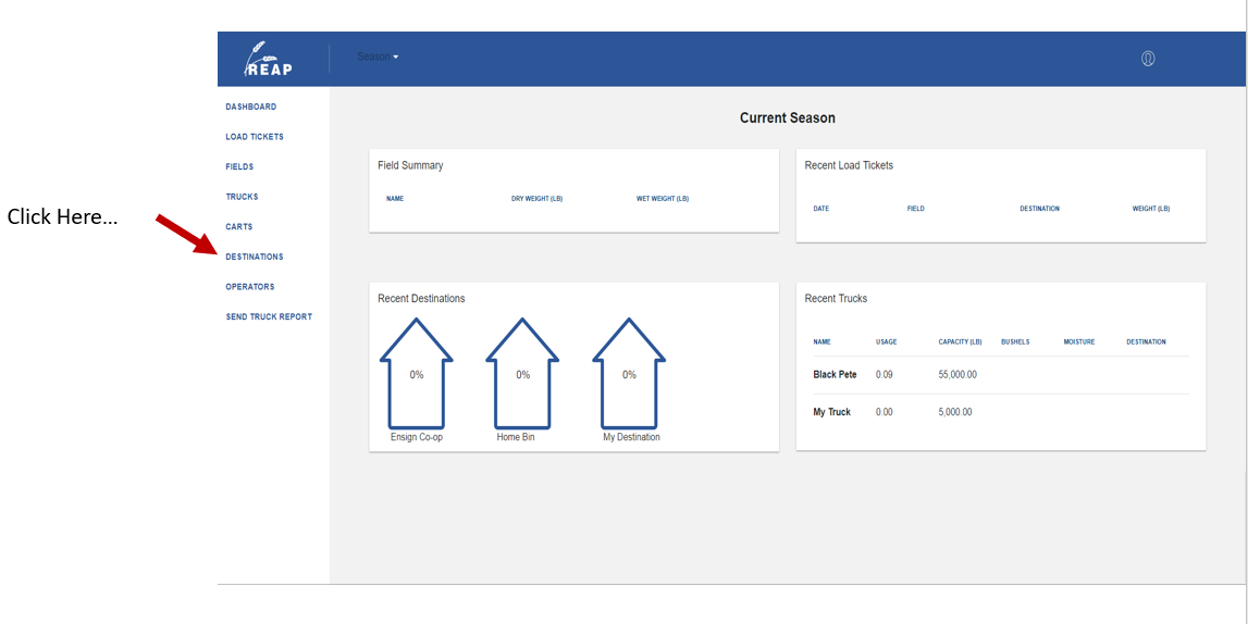 In order to select a Destination within the REAP mobile app, you must first create a destination within the web dashboard, or within the my operations section of the REAP mobile app. To learn more about this see the help articles "adding a ...