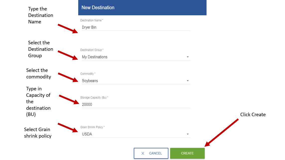 3. A new pop up window will appear, type in the destination details and select the "CREATE" button.