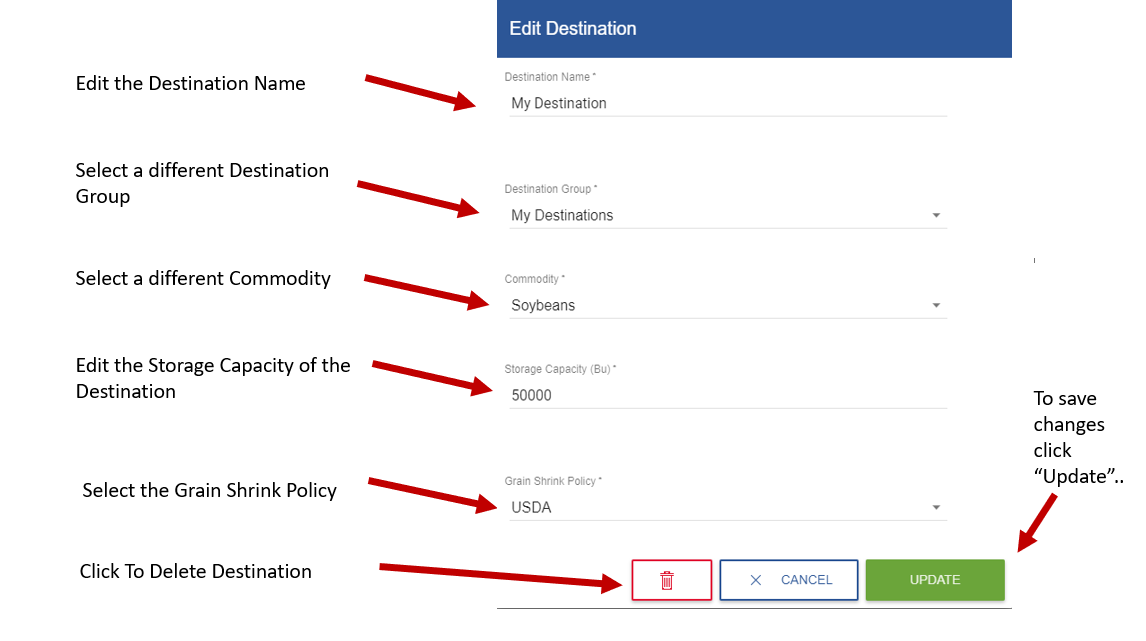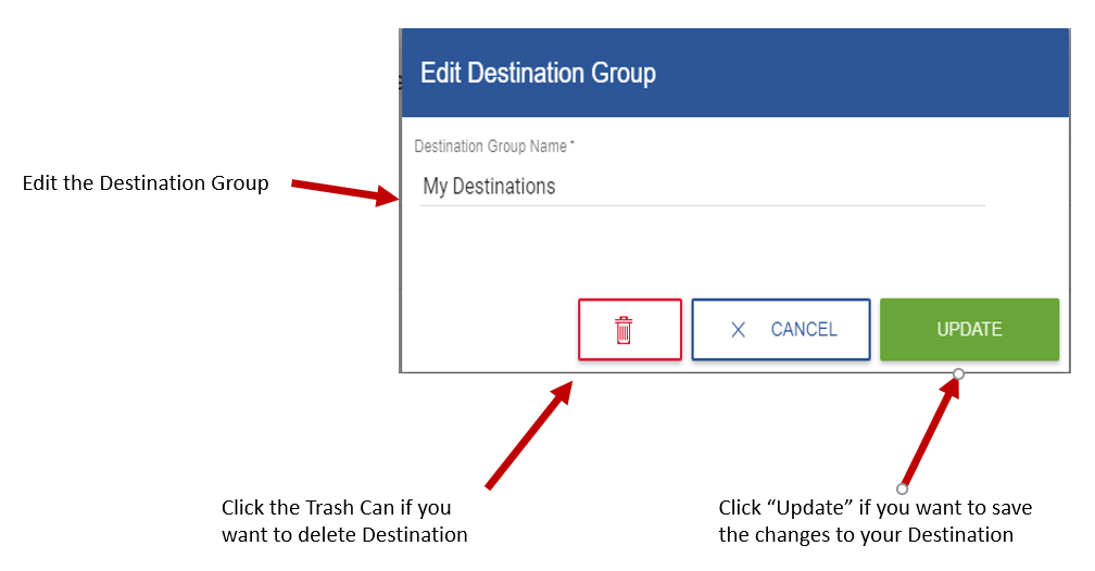 4. A new pop up window will appear. Within this window you can edit the name, re-associate a group, or choose a different commodity. If editing the destination, go ahead and click the UPDATE button after your edits have been made, which will save your changes to the destination.