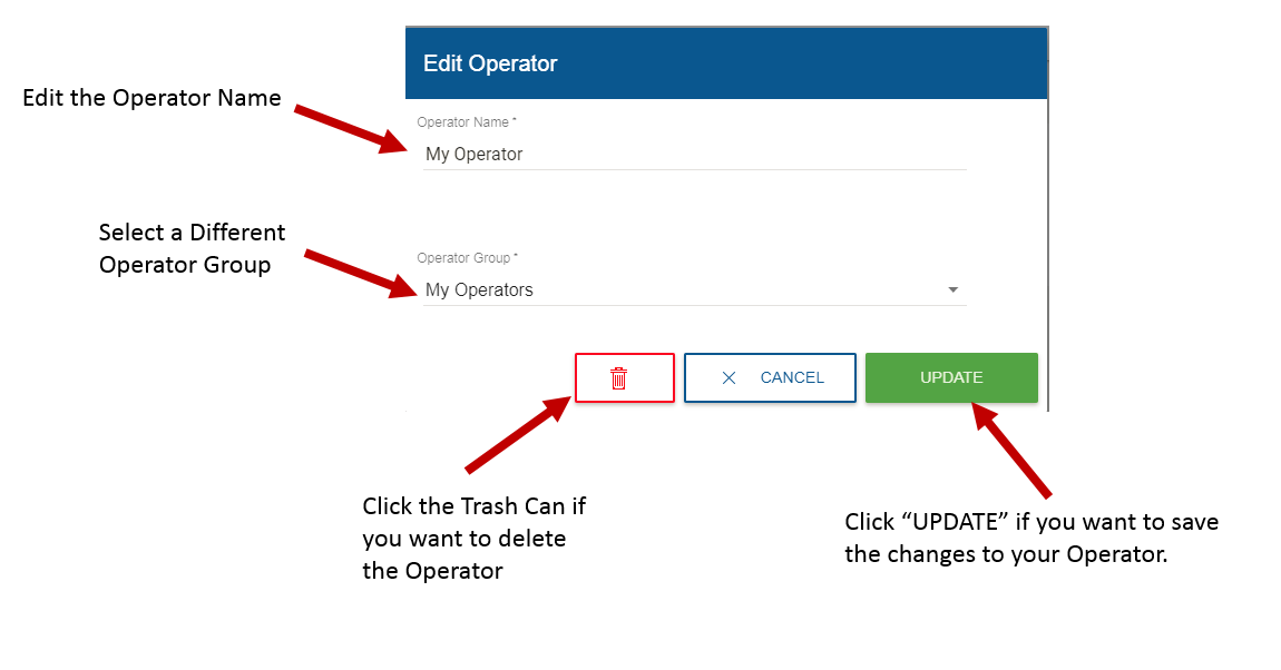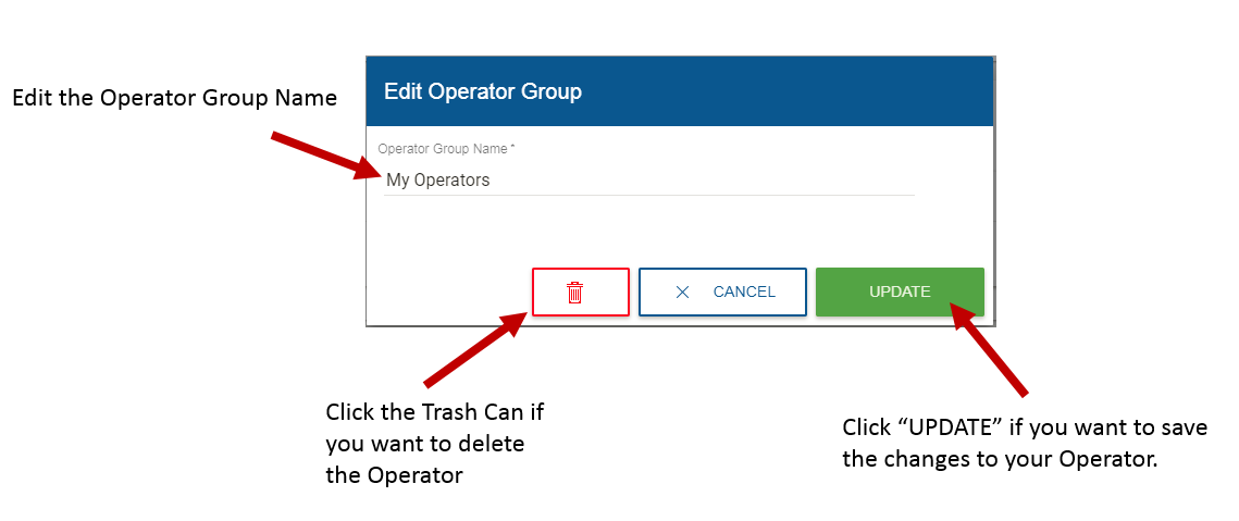 4. A new pop up window will appear. Within this window you can edit the name, re-associate a group, or choose to delete the operator all together. If editing the operator, go ahead and click the UPDATE button after your edits have been made, which will save your changes to the operator.