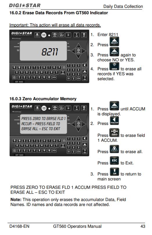 The below instruction shows how to erase records on a GT560 and has been referenced from the GT560 Indicator Manual from Digi-Star.
