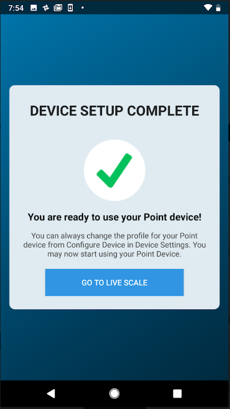 5. The POINT mobile app will now program your POINT device with the correct parameters and calibration. Click go to LIve Scale for the remote display capability of the mobile app.