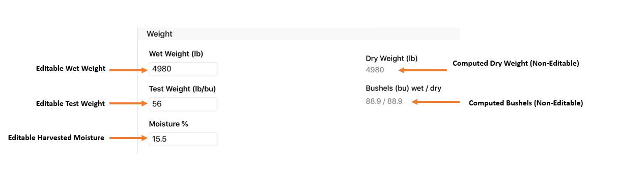 Dry Weight: This weight represents the weight of grain harvested after the computed grain shink has been applied as defaulted with the field grain shrink settings. This number is not editable, and is computed.