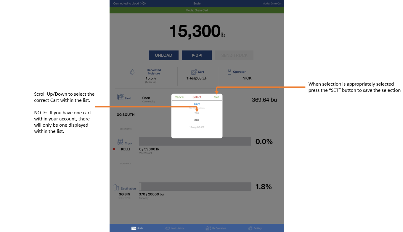 The procedure below details how to select a cart and actively set it on the scale page of the app.