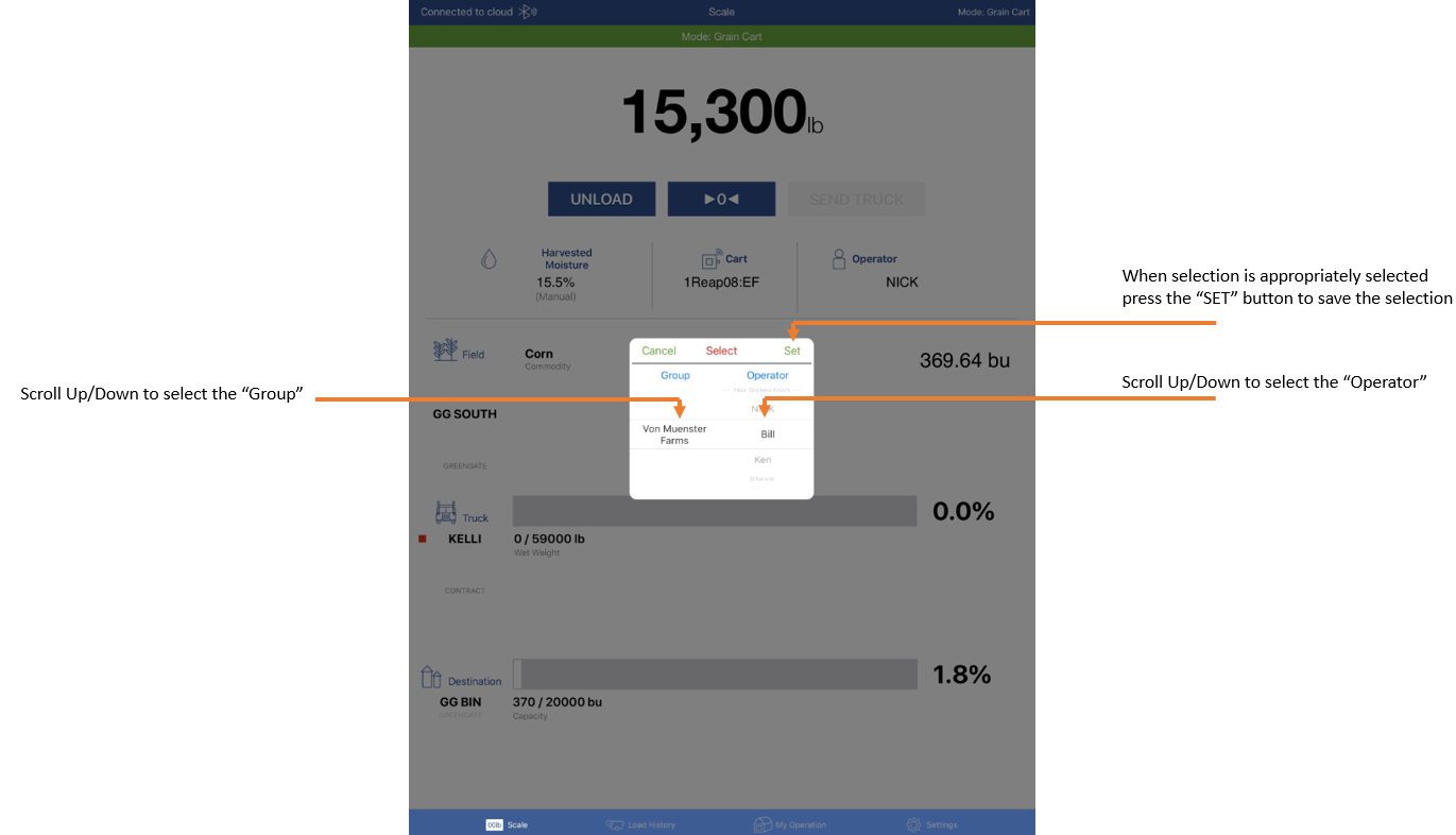 The images below will guide you through selecting an operator within the scale page of the REAP mobile app.