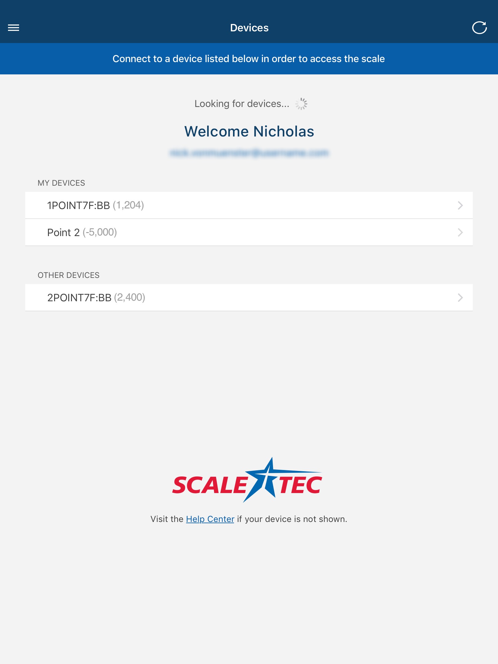 Once you have created your account and connected initially to the device, you will be able to view the live scale reading on your mobile device. POINT will automatically store your login information so you don't have to re-log into the mobile app every time you use it. If you did log out, you will need to log back into the mobile app.